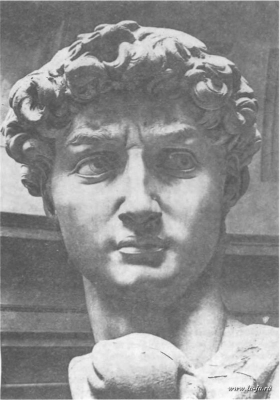 Микеланджело. Давид (фрагмент). 1501—1504. Гипсовая копия с мраморного оригинала. Микеланджело. Умирающий раб. 1513—1516. Мрамор. Лувр. Париж.
